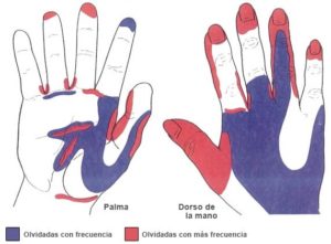 La siguiente imagen muestra las partes que se suelen olvidar cuando NO se adopta una técnica correcta para el lavado de manos: